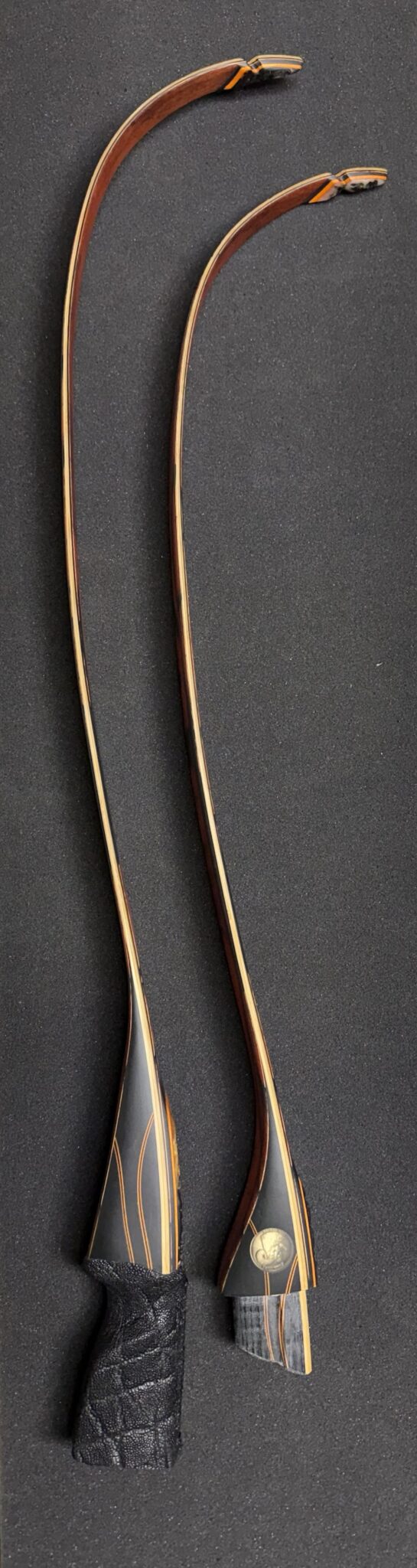 Speed of a recurve, feel of a longbow….Perfect match made in heaven….We mean Big Jim’s custom bow work shop here in Albany, Georgia. These bows are personally hand crafted by Big Jim. Get a slice of heaven in your hands. He will guide you through the process of selecting woods, weight, length, grip, horn overlays, etc. Search through an incredible amount of one-of-kind wood veneers in our inventory, and ask about woods not advertised on our website. We have all sorts of hidden custom options not mentioned on our website, a phone call truly is the only way to find out what kind of secret options Big Jim has up his sleeve.